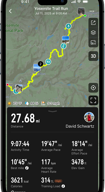Garmin (Connect): résumé solide et ajout de photos à l’activité, mais pas d’épinglettes vocales natives pendant l’effort ni de récit interactif au même niveau.